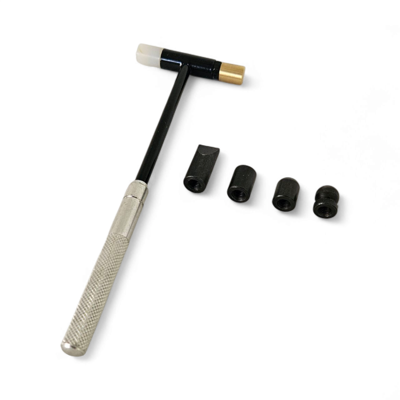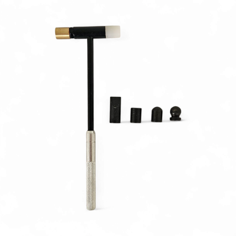 Martillo para forjar y remachado con 6 cabezas intercambiables. Mango de aluminio con empuñadura moleteada. Cada cabeza se atornilla por separado. Incluye cabezales de nylon bola redondo de acero plano de latón plano y cincel.